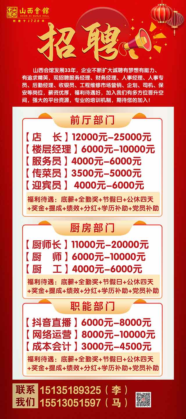 山西会馆发展33年,企业不断扩大诚聘有梦想有能力、有追求精英,现招聘服务经理、财务经理、人事经理、人事专员、后勤经理、收银员、工程维修市场营销、企划、司机、保安等岗位,薪资优厚,福利待遇好,加入我们有多方位晋升空间,强大的平台资源,专业的培训机制,期待您的加入!