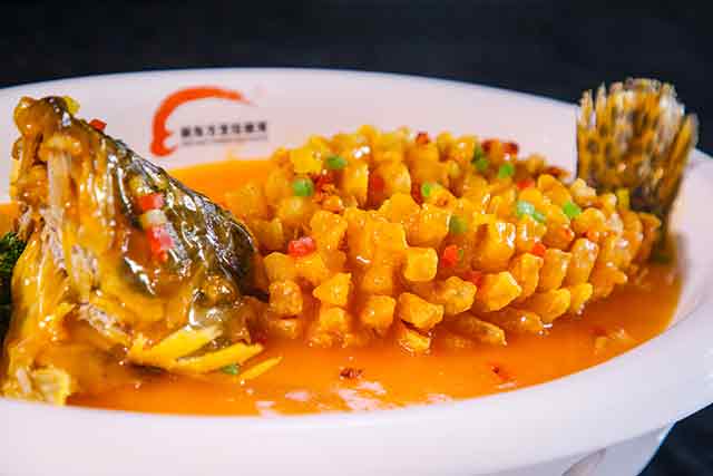 1. 油温六成热(180℃左右),手提鱼尾,先把鱼肉朝下浸炸定型,再放入鱼头。