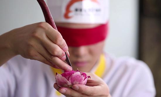 一把雕刻刀,一个简单的水萝卜,就能雕刻出栩栩如生的花朵,绝对会让你匪夷所思,在食雕的世界里,又怎么可能雕刻出令人惊艳的作品呢?只见周大师在助手的帮助下,用布带蒙上双眼,看到小小的雕刻刀在食材上完美的旋转,时而深入,时而浅出,时而划出一道大口子……随着时间的推移,当你还在猜测他将雕刻什么东西时,一朵娇艳欲滴的花朵已出现在眼前。