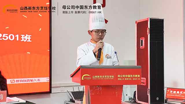 随后,新生代表上台发言。来自25级中餐专业的同学言辞恳切:“能够来到山西新东方职校,我们感到无比幸运。未来的日子里,我们会以饱满的热情投入学习,刻苦钻研专业技能,用专业素养赢得社会认可。”