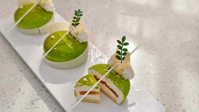 步入展台现场,数十款法式慕斯甜品错落陈列,瞬间让人仿佛置身巴黎街头的精致甜品店。镜头拉近,淋着镜面釉的慕斯蛋糕最为吸睛——深咖色的歌剧院慕斯泛着绸缎般的光泽,轻轻晃动便折射出细腻光影;淡粉色的草莓慕斯表面,新鲜草莓片与薄荷叶错落点缀,颜值与清新感兼备;还有融合了当下流行元素的低糖抹茶慕斯,浅绿底色搭配金色糖针,简约又高级。每一款作品都层次分明,切开后可见细腻的慕斯体、醇厚的夹心与酥脆的饼底,一口下去的丰富口感,藏着对法式甜品工艺的极致追求。